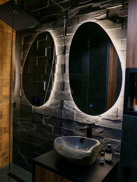 Фигурная форма зеркал это всегда интересное решение в интерьере,а благодаря LED подсветке становится более особенным уникальным.